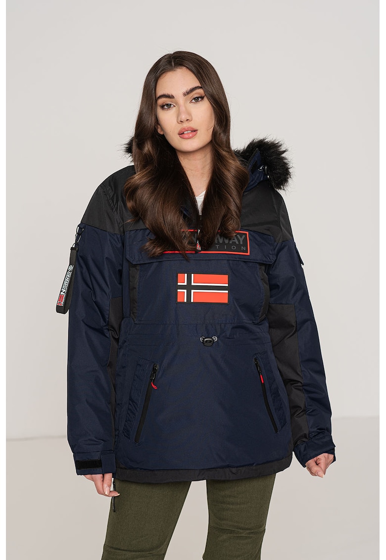 Caracteristici Tip produs: geaca Culoare: bleumarin Imprimeu: logo Material: sintetic Croiala: regular fit Gluga: cu gluga Lungime maneca: maneca lunga Buzunare: 5 Detalii: model pull on