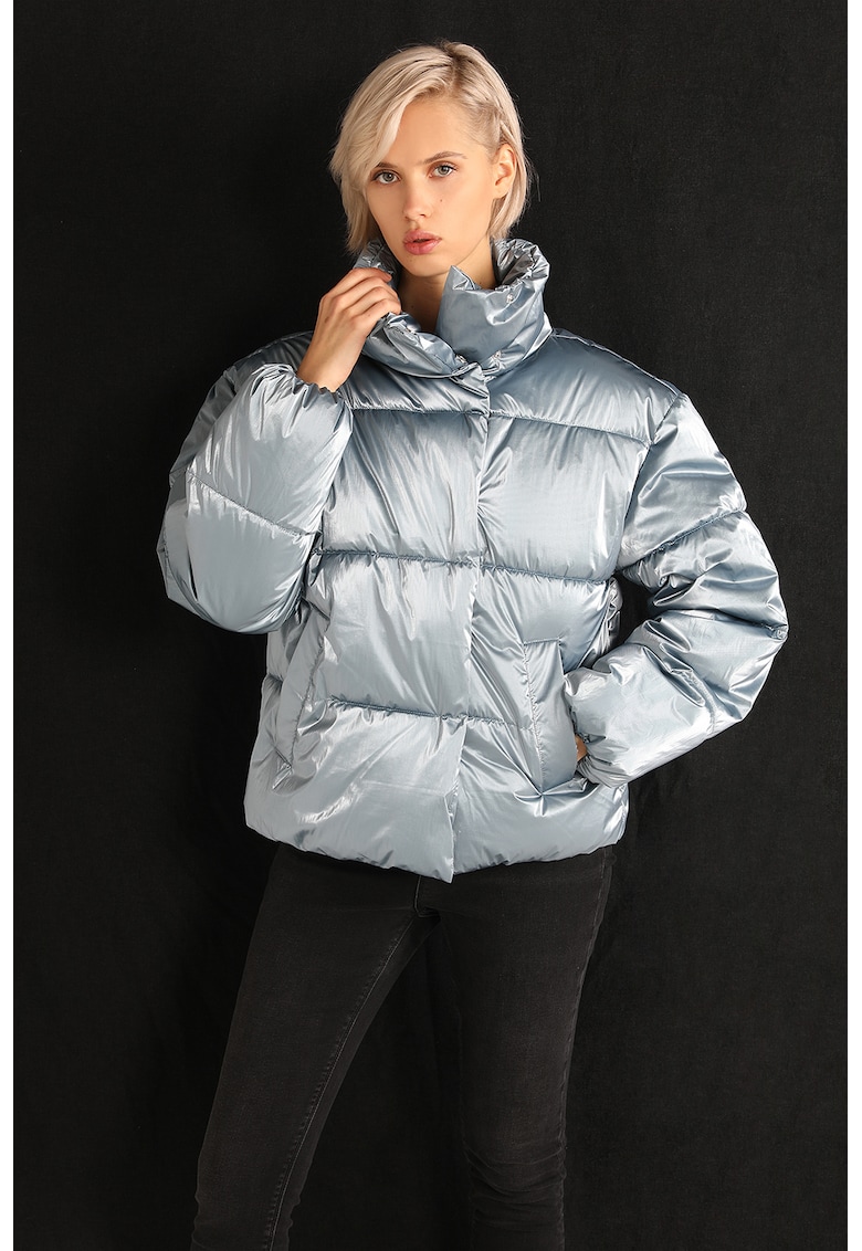 Caracteristici Culoare: albastru deschis Imprimeu: uni Material: poliamida Croiala: regular fit Guler: inalt Gluga: fara gluga Lungime maneca: maneca lunga Buzunare: 2 Detalii: aspect metalizat Sistem inchidere: capse Compozitie Exterior: 100% poliamida Captuseala: 100% poliester