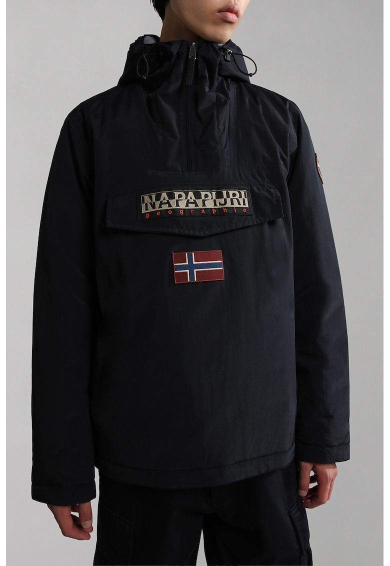 Caracteristici Tip produs: geaca Culoare: negru Material: poliamida Croiala: regular fit Imprimeu: logo Gluga: cu gluga Lungime maneca: maneca lunga Buzunare: 2 laterale