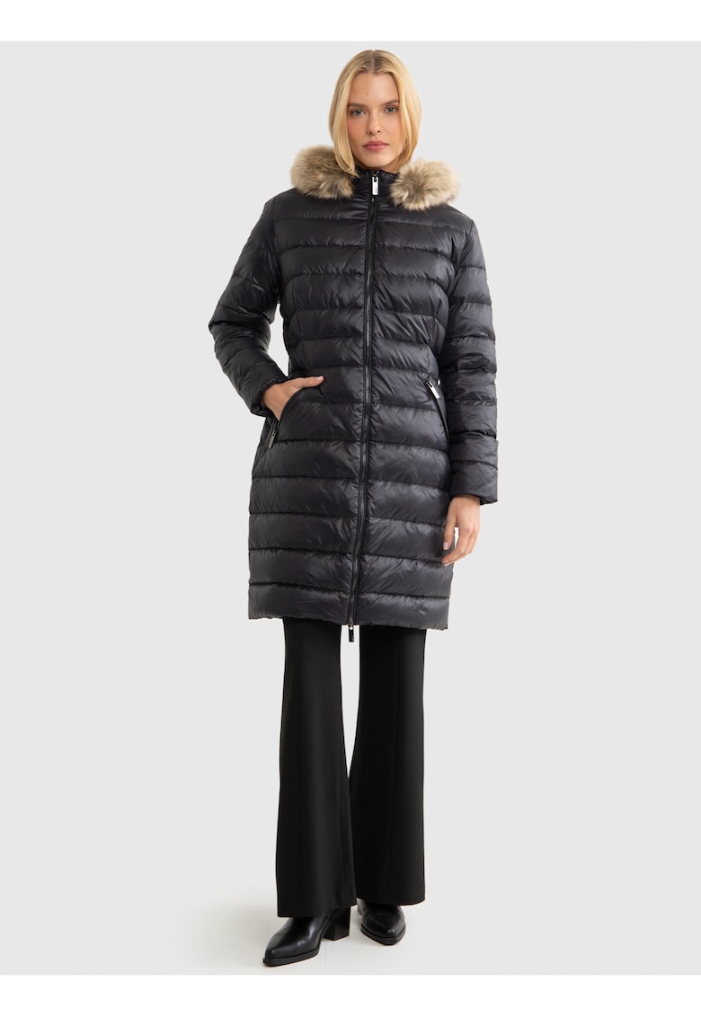 Caracteristici Tip produs: geaca Culoare: negru Imprimeu: uni Material: sintetic Croiala: regular fit Guler: inalt Gluga: cu gluga Lungime maneca: maneca lunga Buzunare: 2 Detalii: aspect matlasat Sistem inchidere: fermoar Compozitie Exterior: 100% poliamida