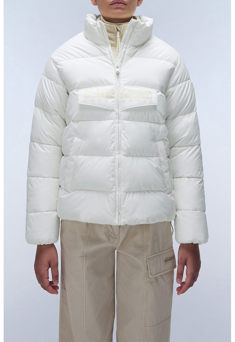 Caracteristici Tip produs: geaca Culoare: alb optic Imprimeu: logo Material: sintetic Croiala: lejer Guler: inalt Gluga: fara gluga Lungime maneca: maneca lunga Buzunare: frontale Detalii: snur pentru ajustare la garnitura