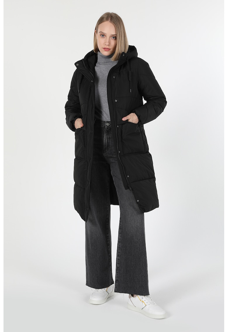 Caracteristici Tip produs: geaca Culoare: negru Imprimeu: uni Material: sintetic Croiala: regular fit Guler: guler ridicat in partea din fata Gluga: cu gluga Maneci: cu mansete elastice Lungime maneca: maneca lunga Buzunare: clape Detalii: design matlasat Sistem inchidere: fermoar