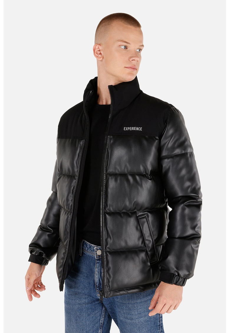 Caracteristici Tip produs: geaca Culoare: negru Material: sintetic Croiala: regular fit Imprimeu: uni Gluga: fara gluga Guler: inalt Lungime maneca: maneca lunga Buzunare: 2 oblice Detalii: aspect matlasat Sistem inchidere: fermoar Compozitie Exterior: cu 100% pelicula de poliuretan