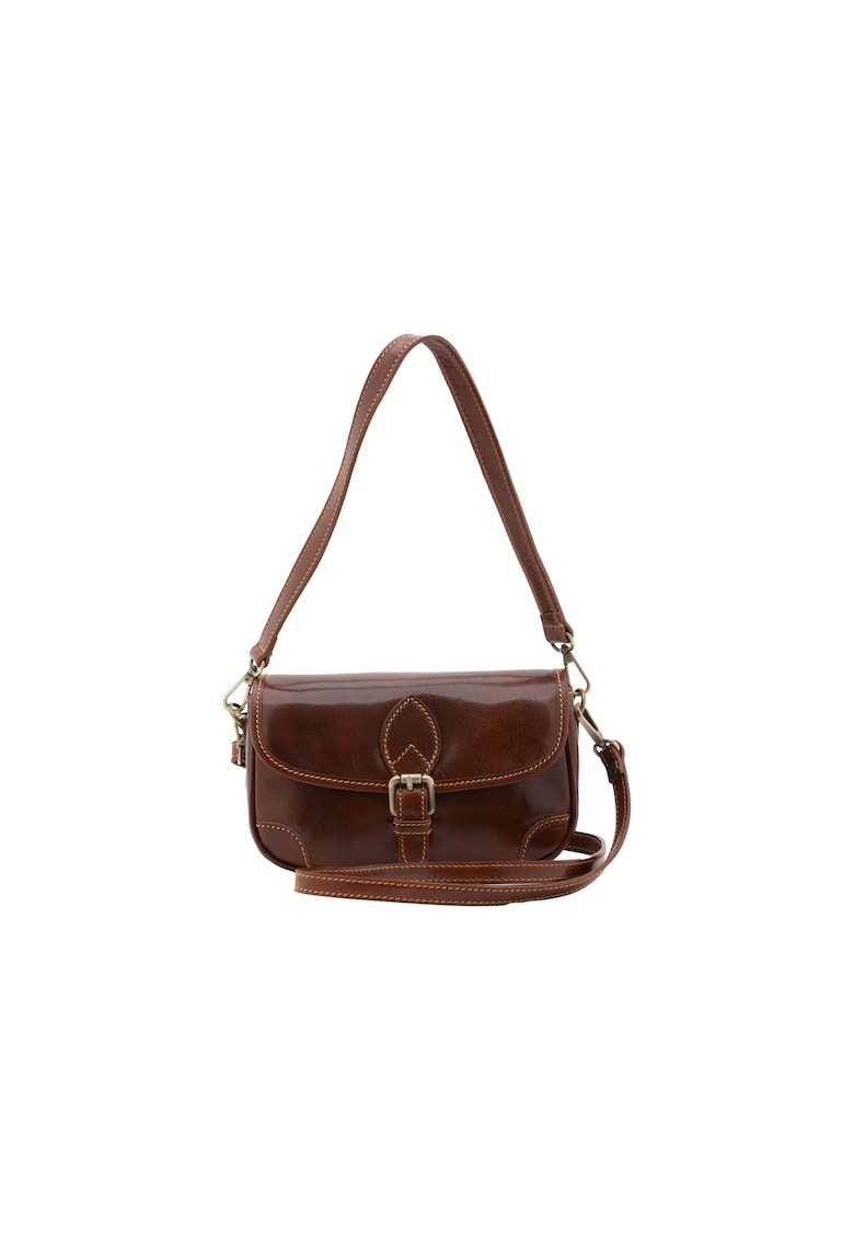 Caracteristici Culoare: maro Material: piele naturala Model: crossbody Stil: casual Imprimeu: uni Barete: detasabile Culoare elemente metalice: auriu Sistem inchidere: capse Compozitie Exterior: piele Captuseala: bumbac Dimensiuni Dimensiune (cm): 14 x 23 x 9 cm