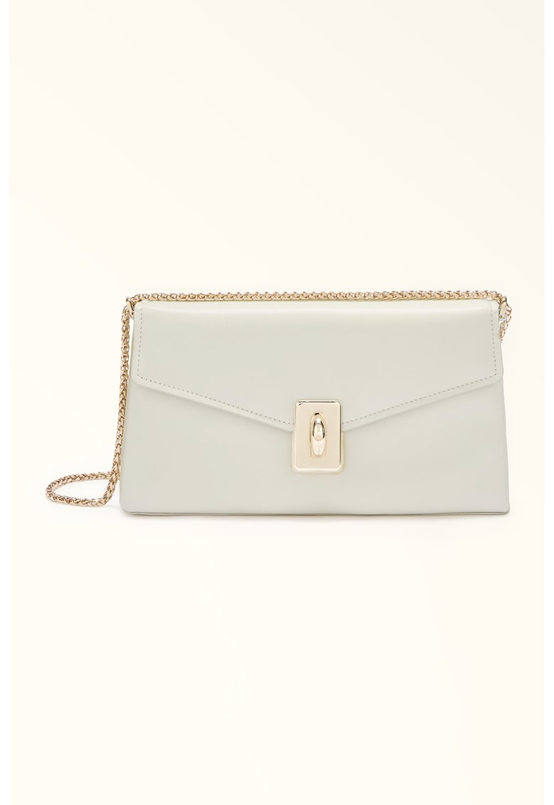 Caracteristici Culoare: alb murdar Material: piele naturala Model: plic Stil: elegant Imprimeu: uni Barete: bareta din lant Buzunare: interior Compartimente: un compartiment Culoare elemente metalice: auriu Sistem inchidere: sistem metalic