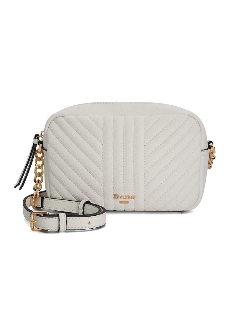 Caracteristici Culoare: alb fildes Material: piele ecologica Model: crossbody Stil: casual Imprimeu: uni Barete: cu insertii din lant Buzunare: interior Culoare elemente metalice: auriu Sistem inchidere: fermoar Detalii: aspect matlasat Compozitie Exterior: material sintetic Captuseala: material sintetic Dimensiuni Dimensiune (cm): 14x20x8