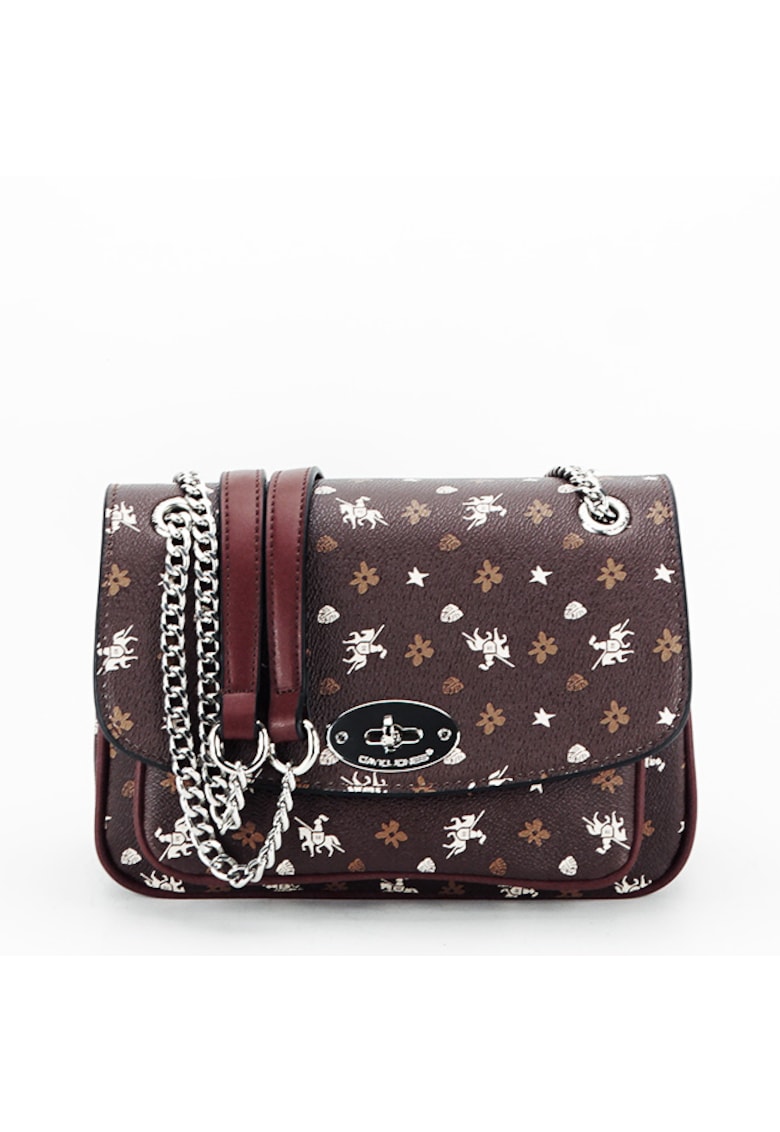 Caracteristici Culoare: maro inchis Material: piele ecologica Model: de umar Stil: casual Imprimeu: cu model Barete: 1 nedetasabila Buzunare: 1 exterior cu fermoar