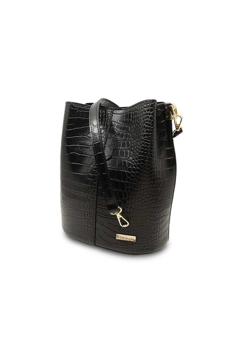 Caracteristici Culoare: negru Material: piele naturala Model: bucket Imprimeu: cu model Maner: 1 detasabil Buzunare: unul interior cu fermoar Compartimente: 2 compartimente cu 1 separator cu fermoar Culoare elemente metalice: auriu Sistem inchidere: capse magnetice Detalii: dust bag inclusa