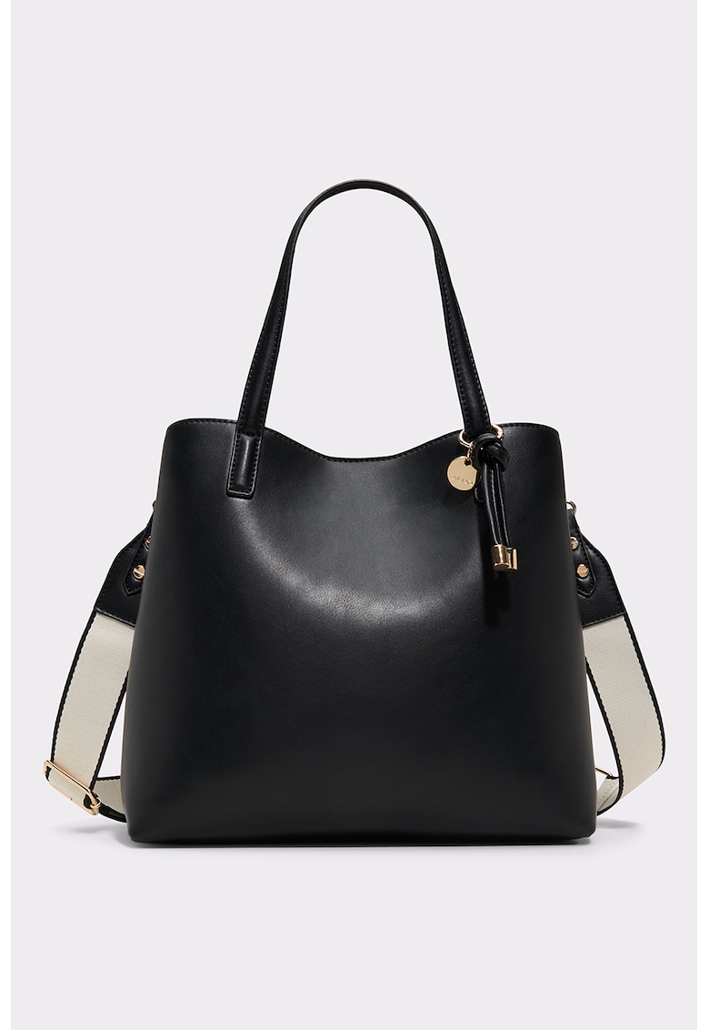 Caracteristici Culoare: negru Material: piele ecologica Model: de umar Stil: casual Imprimeu: uni Maner: 2 fixe Barete: ajustabile si detasabile Buzunare: interior Compartimente: 2 compartimente Culoare elemente metalice: auriu Sistem inchidere: capse magnetice Compozitie Exterior: 100% poliuretan Captuseala: 100% poliuretan Dimensiuni Dimensiune (cm): 27x27x16
