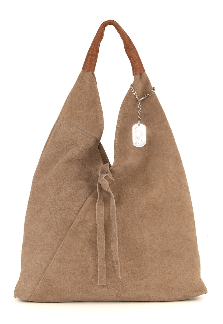 Caracteristici Culoare: maro taupe Material: piele intoarsa Model: de umar Stil: casual Imprimeu: uni Maner: fix Compartimente: un compartiment Culoare elemente metalice: argintiu Sistem inchidere: snur Detalii: accesoriu logo Compozitie Exterior: piele intoarsa Dimensiuni Dimensiune (cm): 40x31x2