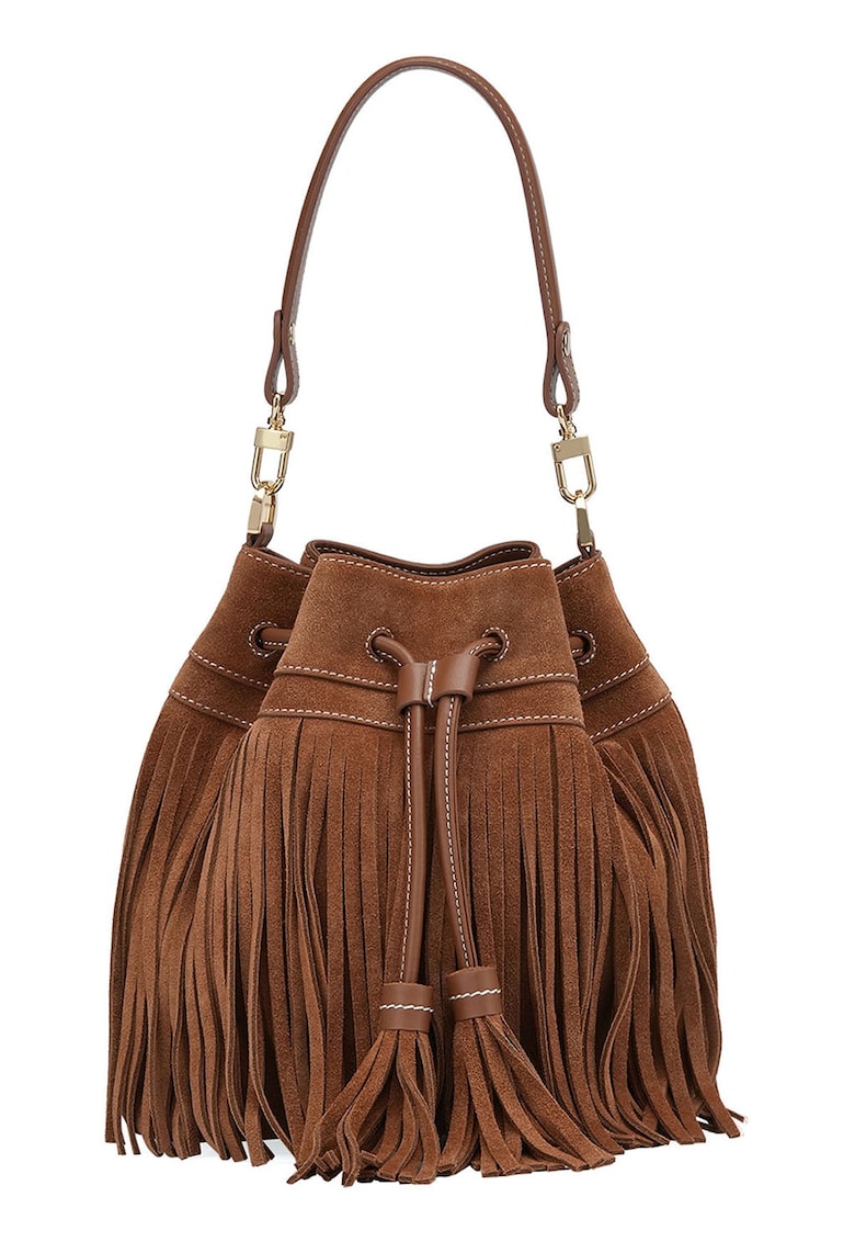 - detasabile Buzunare: interior Culoare elemente metalice: auriu Sistem inchidere: snur Detalii: franjuri Compozitie Exterior: piele intoarsa Dimensiuni Dimensiune (cm): 24x24x13