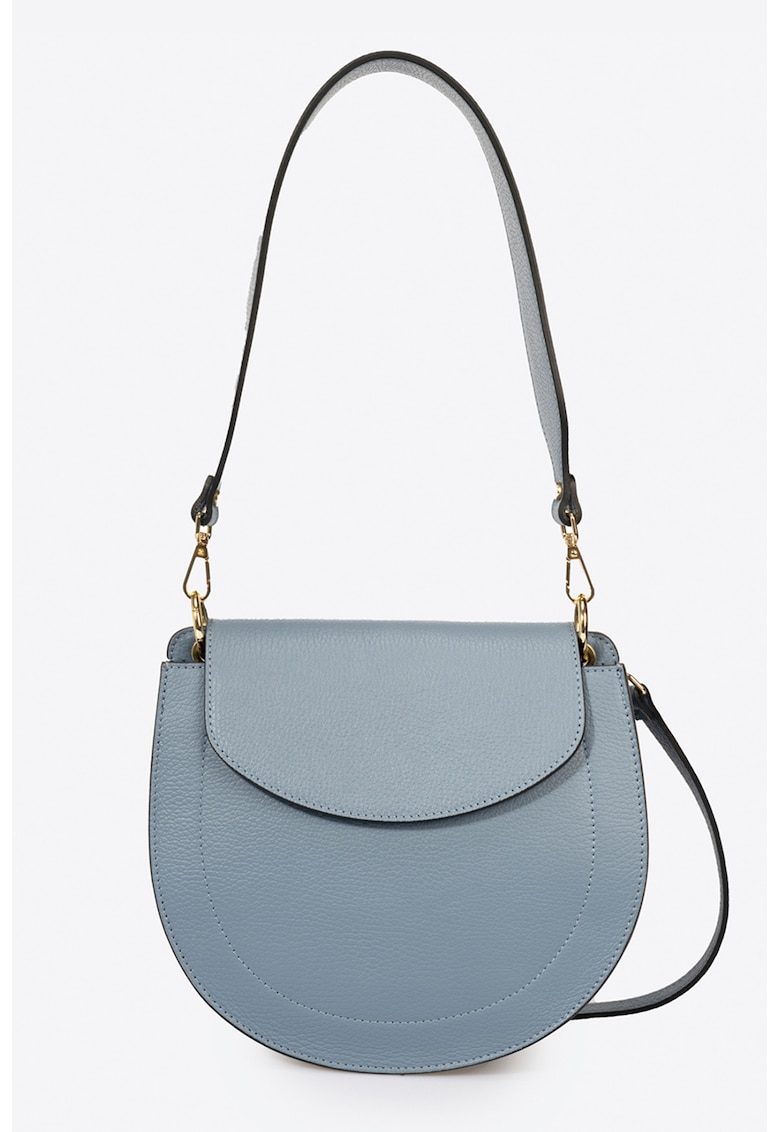 Caracteristici Culoare: albastru prafuit Material: piele naturala Model: de umar Stil: casual Imprimeu: uni Maner: detasabil Compartimente: 2 compartimente Culoare elemente metalice: auriu Sistem inchidere: capse magnetice