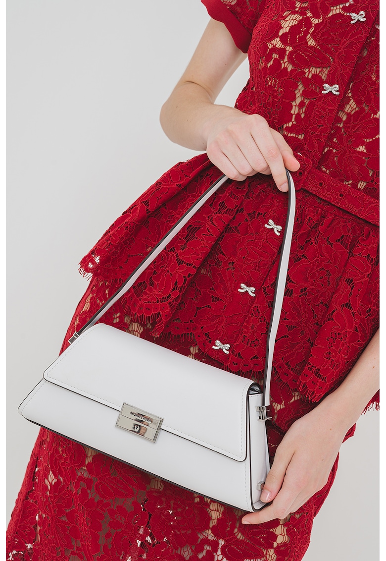 Caracteristici Culoare: alb Material: piele naturala Model: de umar Stil: casual Imprimeu: uni Maner: unul Buzunare: unul Compartimente: 1 Culoare elemente metalice: argintiu Sistem inchidere: clapeta Compozitie Exterior: piele Dimensiuni Dimensiune (cm): 17x30x7.6