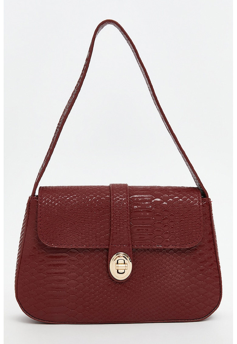 Caracteristici Culoare: visiniu Material: piele ecologica Model: de umar Stil: casual Imprimeu: cu model Barete: 1 nedetasabila Buzunare: interior Compartimente: un compartiment Culoare elemente metalice: auriu Sistem inchidere: sistem metalic