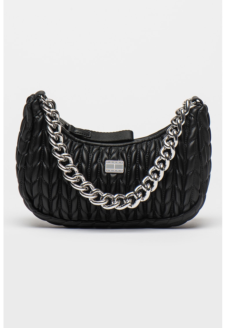 Caracteristici Culoare: negru Material: piele ecologica Model: de umar Stil: casual Imprimeu: uni Maner: lant Buzunare: interior Culoare elemente metalice: argintiu Sistem inchidere: fermoar Detalii: aspect matlasat Compozitie Exterior: 100% poliuretan Dimensiuni Dimensiune (cm): 17x26x7