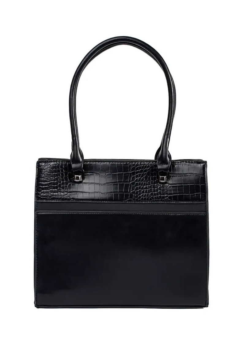 Caracteristici Culoare: negru Material: piele ecologica Model: de mana Stil: casual Imprimeu: uni Maner: 2 Barete: una ajustabila si detasabila Culoare elemente metalice: argintiu Sistem inchidere: fermoar Detalii: model piele de crocodil Compozitie Material garnituri: poliester