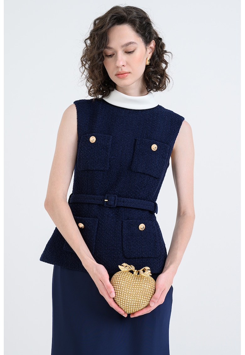 - din lant Buzunare: interior Compartimente: un compartiment Culoare elemente metalice: auriu Sistem inchidere: sistem metalic Detalii: aplicatii din strasuri Compozitie Exterior: 100% poliester Dimensiuni Dimensiune (cm): 13x11x8