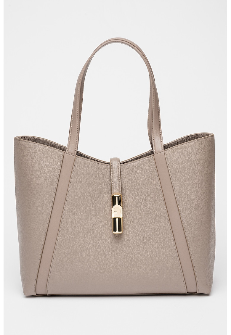 Caracteristici Culoare: maro taupe deschis Material: piele naturala Model: tote Stil: casual Imprimeu: uni Maner: doua Buzunare: interior Compartimente: 1 Culoare elemente metalice: auriu Sistem inchidere: sistem metalic Compozitie Exterior: 100% piele Captuseala: 90% poliester