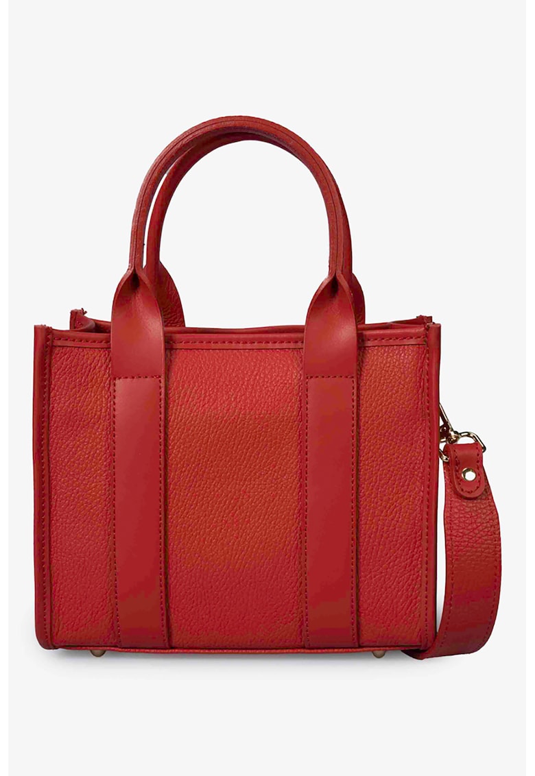 Caracteristici Culoare: rosu Material: piele naturala Model: tote Stil: casual Imprimeu: uni Maner: 2 tubulare Barete: una ajustabila si detasabila Compartimente: 1 Culoare elemente metalice: auriu Sistem inchidere: fermoar Detalii: picioruse metalice Compozitie Exterior: piele Dimensiuni Dimensiune (cm): 18 x 22 x 9 cm