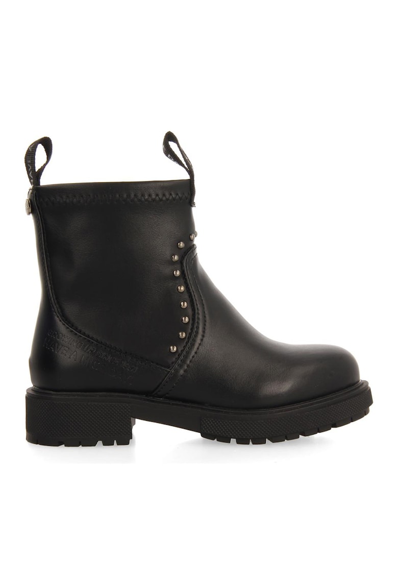Caracteristici generale Tip produs: ghete Culoare: negru Material: piele ecologica Stil: casual Lungime: glezna Sistem inchidere: fermoar Tip talpa: plata Detalii: nituri metalice Detalii material Partea superioara: alte materiale Material interior: alte materiale