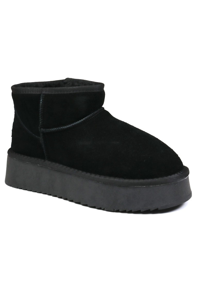 Caracteristici Tip: cu talpa joasa Culoare: negru Material: piele intoarsa Imprimeu: uni Stil: casual Varf: rotund Tip talpa: flatform Detalii: captuseala de blana sintetica Culoare elemente metalice: argintiu Sistem inchidere: fara inchidere Compozitie Material talpa: alte materiale Dimensiuni Inaltime toc: 0 cm
