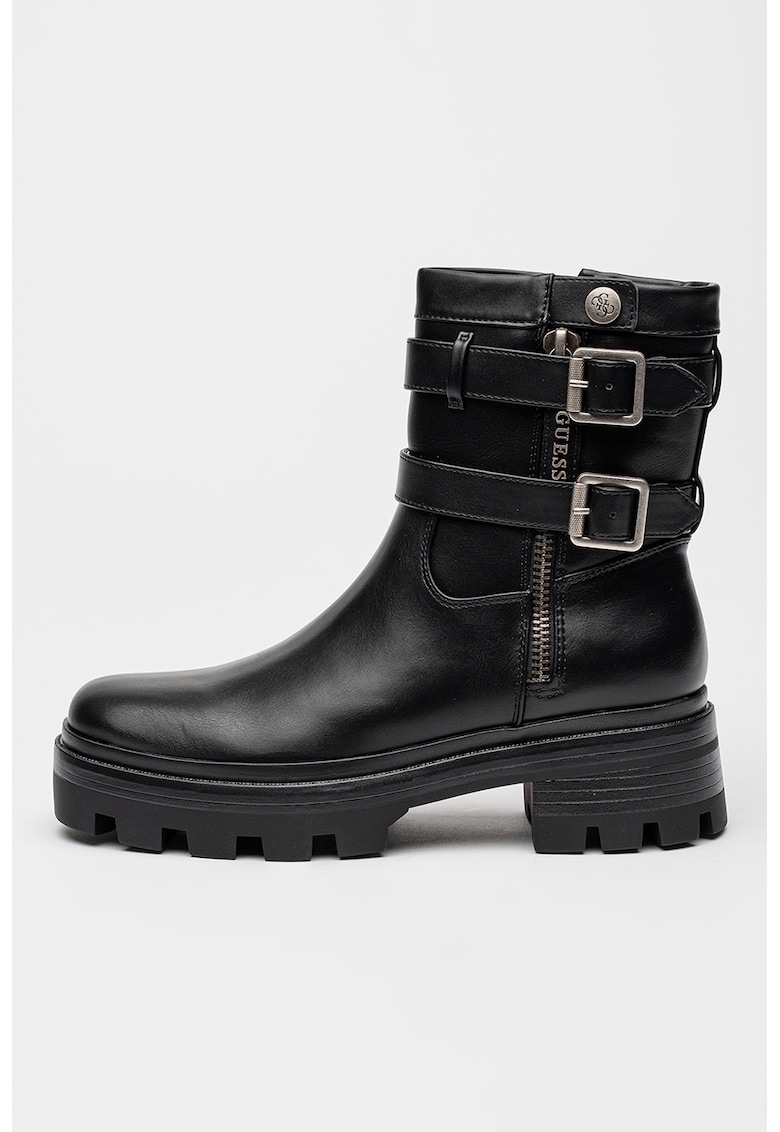 Caracteristici Tip: cu toc Culoare: negru Material: piele ecologica Imprimeu: uni Stil: casual Varf: rotund Tip toc: masiv Culoare elemente metalice: auriu Sistem inchidere: fermoar Compozitie Partea superioara: alte materiale Material interior: alte materiale Material talpa: alte materiale