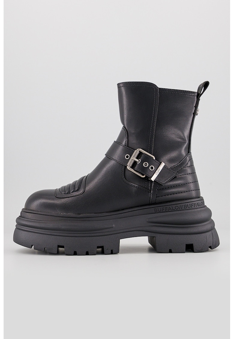 Caracteristici Tip: cu platforma Culoare: negru Material: piele ecologica Stil: casual Varf: rotund Tip toc: masiv Tip talpa: flatform Detalii: bareta decorativa cu catarama Culoare elemente metalice: argintiu
