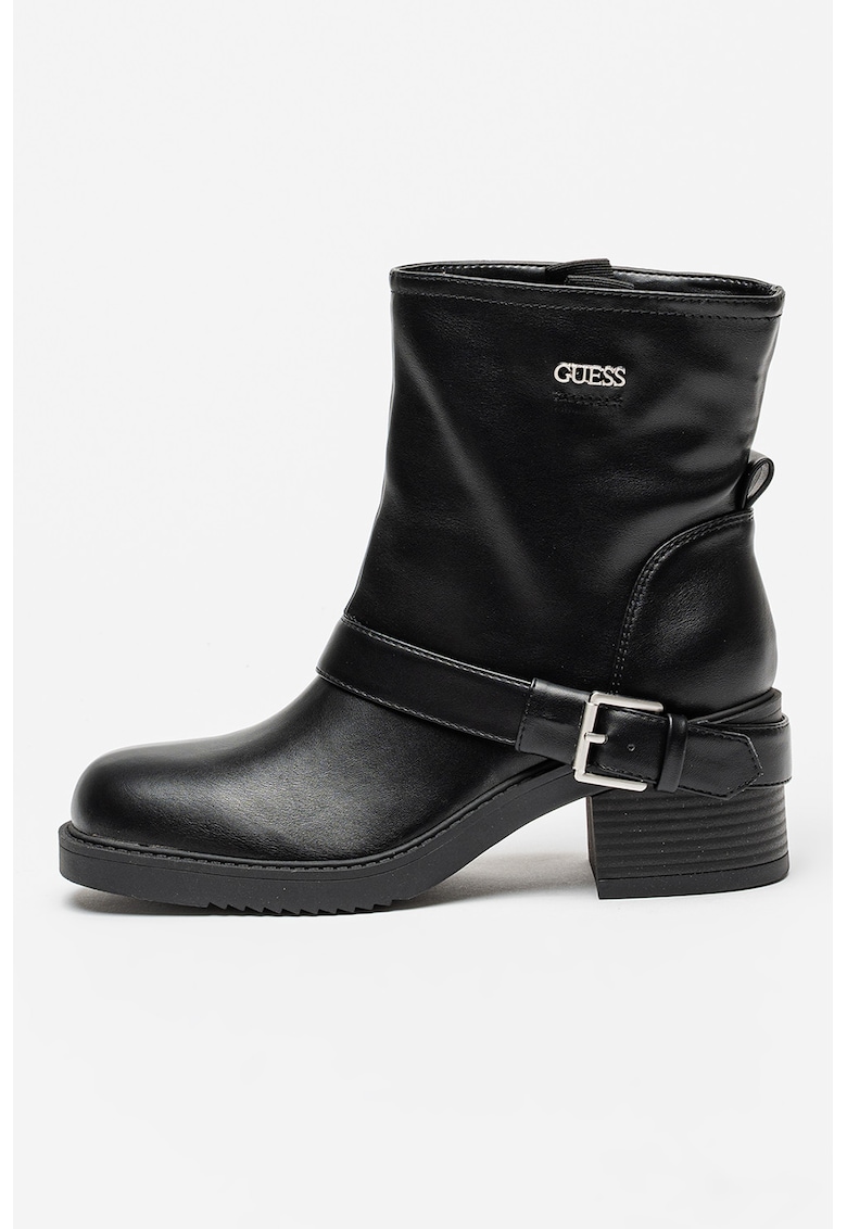 Caracteristici Tip: cu toc Culoare: negru Material: piele ecologica Stil: casual Varf: rotund Tip toc: masiv Culoare elemente metalice: argintiu Compozitie Partea superioara: alte materiale Material interior: textil