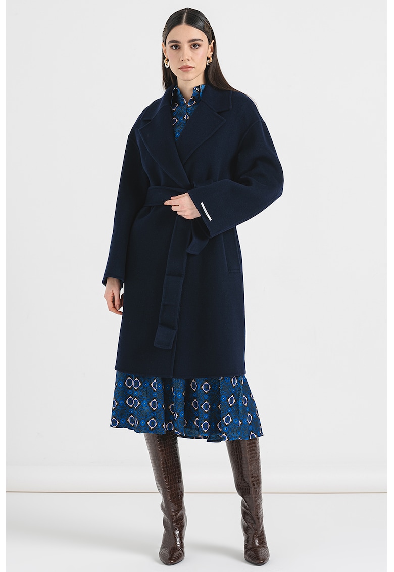 Caracteristici Tip produs: palton Culoare: albastru ultramarin Imprimeu: uni Stil: casual Material: lana Croiala: lejer Guler: cu revere decupate Maneci: cazute Lungime maneca: maneca lunga Buzunare: 2 laterale Detalii: cordon in talie Sistem inchidere: nasturi Compozitie Exterior: 100% lana Info model Modelul poarta un produs de marimea S/38 IT. Marimi model: 177 cm inaltime