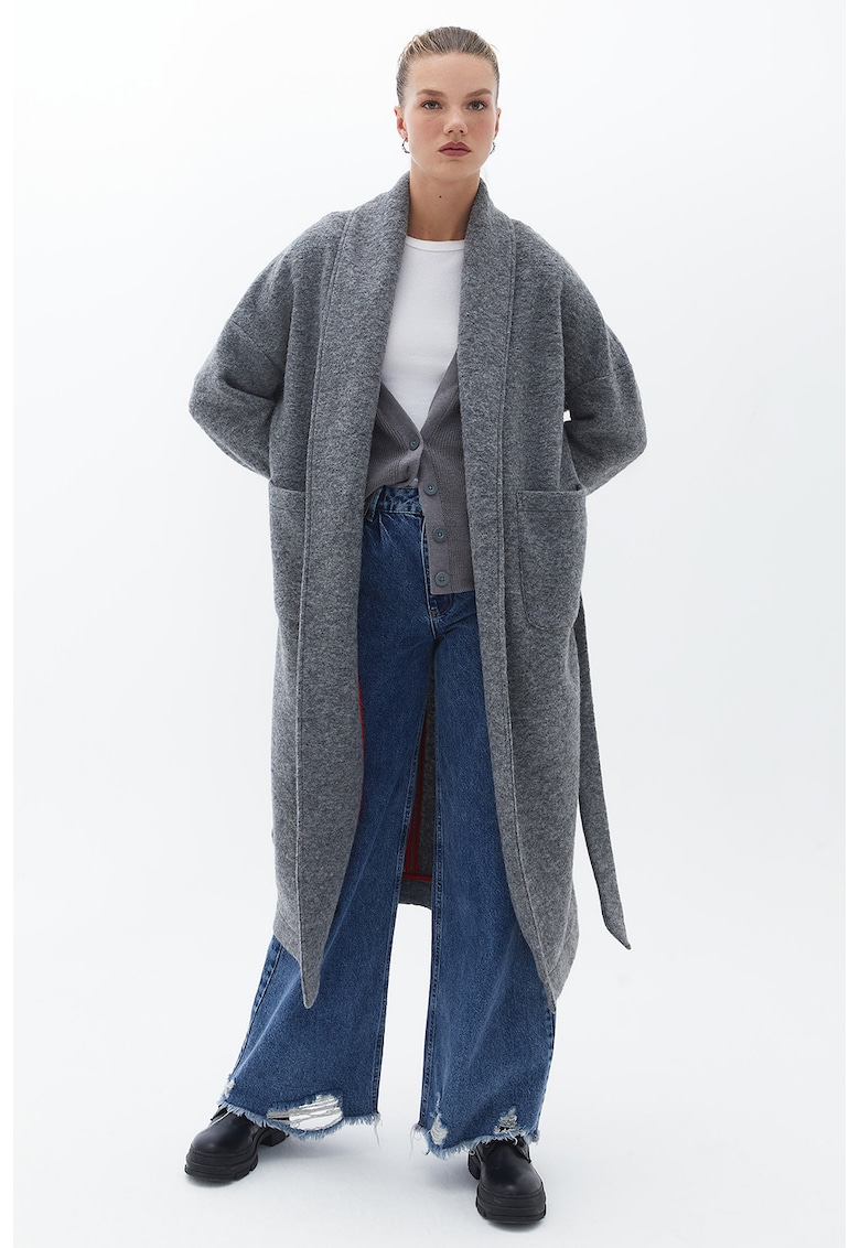 - lana Croiala: regular fit Guler: cu revere Maneci: cazute Lungime maneca: maneca lunga Buzunare: laterale Sistem inchidere: cordon Compozitie Exterior: 63% lana