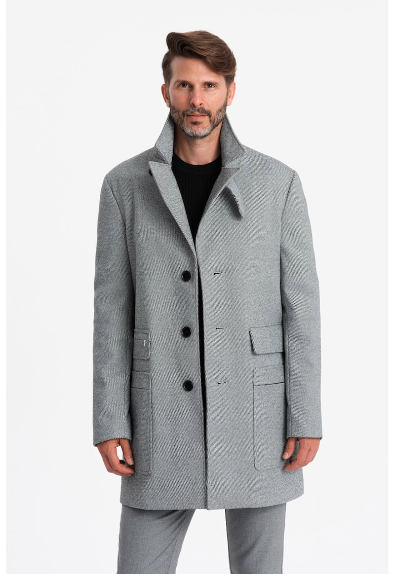 Caracteristici Tip produs: palton Culoare: gri deschis melange Material: poliester Stil: elegant Imprimeu: uni Croiala: regular fit Buzunare: 2 cu clapa