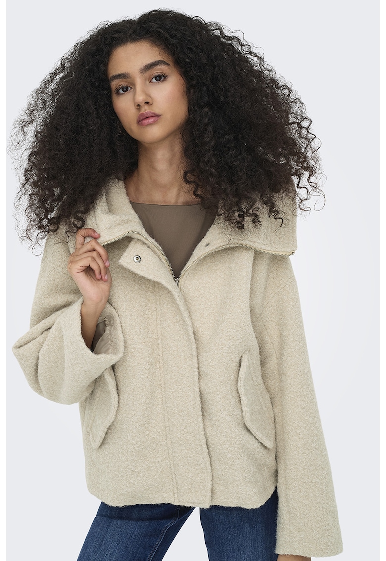 Caracteristici Tip produs: palton Culoare: bej inchis Imprimeu: uni Stil: casual Material: poliester Croiala: lejer Guler: inalt Maneci: cazute Lungime maneca: maneca lunga Buzunare: 2 cu clapa Sistem inchidere: fermoar