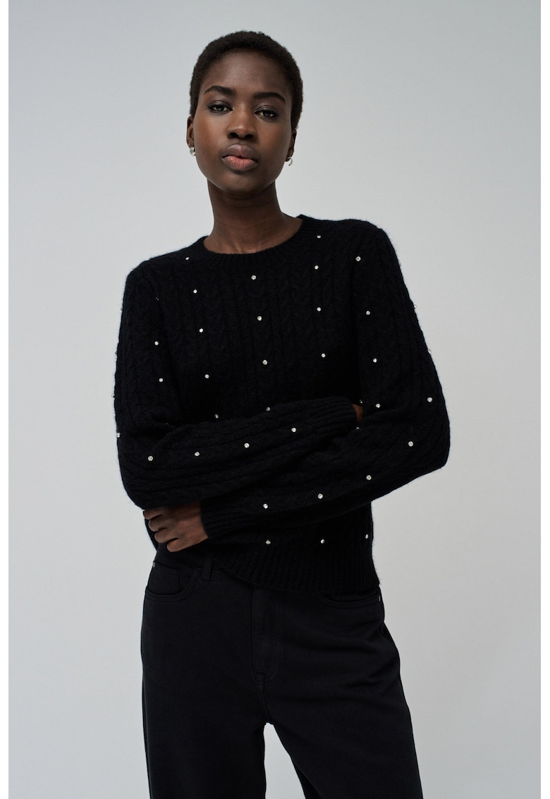 - tricot Model: decolteu la baza gatului Croiala: regular fit Sistem inchidere: fara inchidere Lungime maneca: maneca lunga Detalii: strasuri