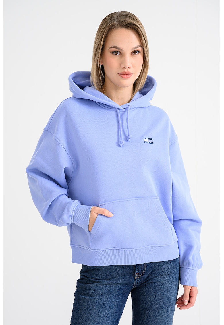 Caracteristici Tip produs: hanorac Culoare: albastru pastel Imprimeu: uni Croiala: regular fit Sistem inchidere: fara inchidere Material: bumbac Maneci: cazute Lungime maneca: maneca lunga Buzunare: kangaroo Compozitie Exterior: 100% bumbac Info model Modelul poarta un produs de marimea S. Marimi model: 180 cm inaltime