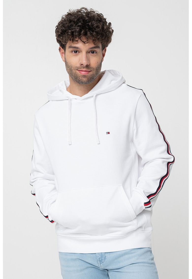 - alb optic Imprimeu: logo Material: bumbac Croiala: regular fit Sistem inchidere: fara inchidere Buzunare: kangaroo Lungime maneca: maneca lunga Compozitie Exterior: 100% bumbac organic Info model Modelul poarta un produs de marimea M. Marimi model: 179 cm inaltime