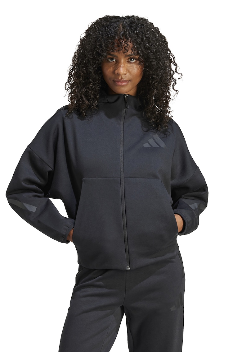 Caracteristici Tip produs: hanorac Culoare: negru Imprimeu: uni Croiala: lejer Sistem inchidere: fermoar Material: poliester