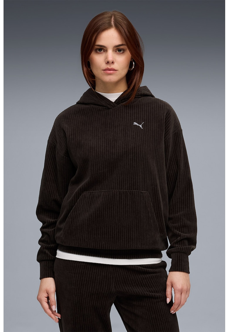 Caracteristici Tip produs: hanorac Culoare: negru Imprimeu: uni Croiala: regular fit Sistem inchidere: fara inchidere Material: reiat Maneci: cazute Lungime maneca: maneca lunga Detalii: aspect striat