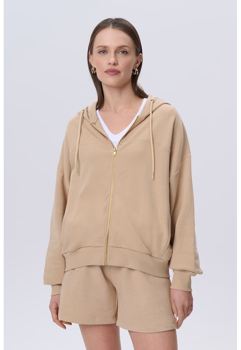 Caracteristici Tip produs: hanorac Culoare: maro nisip Imprimeu: uni Croiala: lejer Sistem inchidere: fermoar Material: bumbac Maneci: maneci cazute Lungime maneca: maneca lunga Buzunare: 2 oblice Detalii: gluga cu snur ajustabil Compozitie Exterior: 100% bumbac