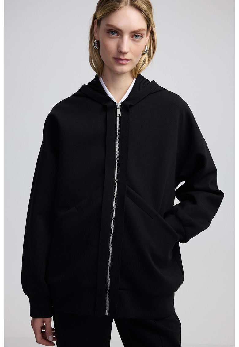 Caracteristici Tip produs: hanorac Culoare: negru Imprimeu: uni Croiala: lejer Sistem inchidere: fermoar Material: poliester