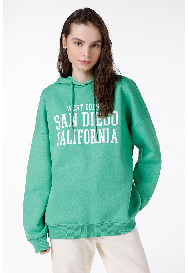 Caracteristici Tip produs: hanorac Culoare: verde deschis Imprimeu: text Croiala: lejer Sistem inchidere: fara inchidere Material: sintetic