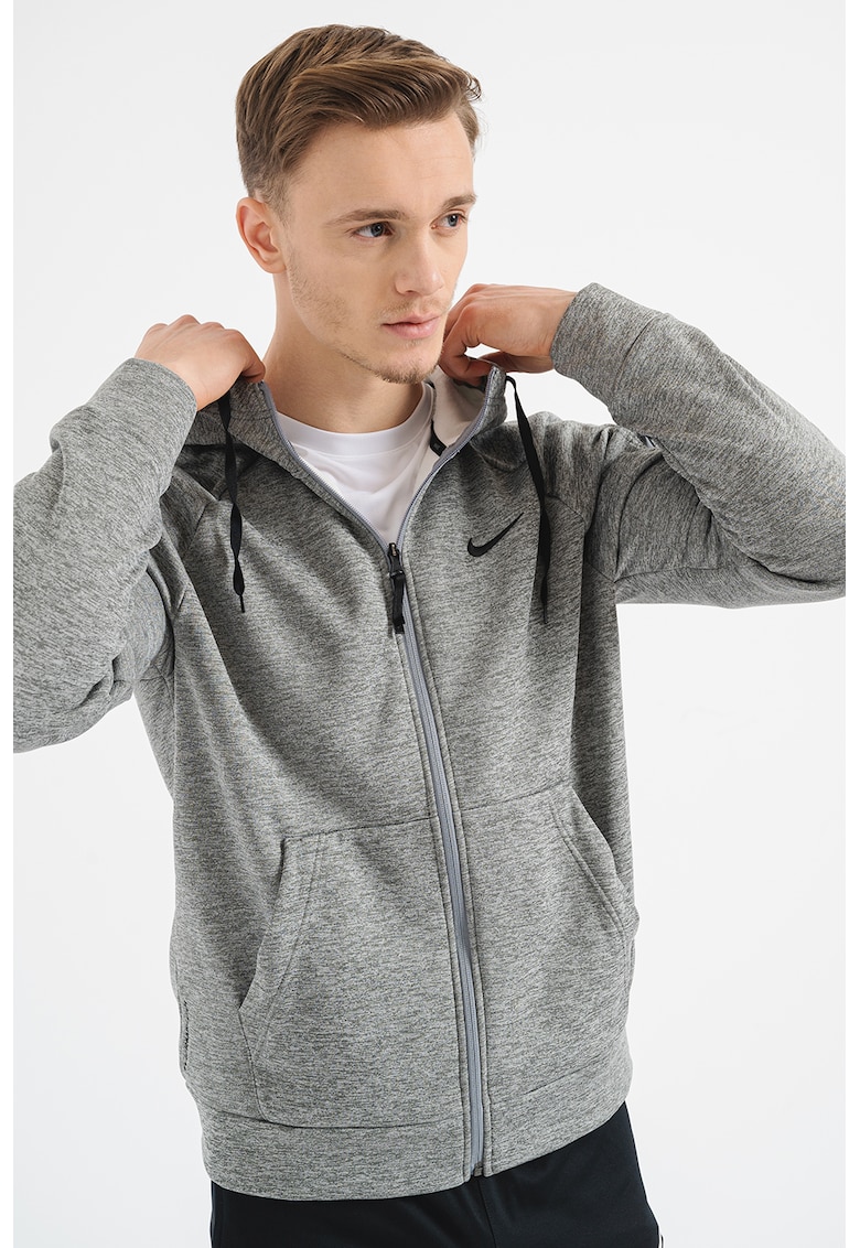 Caracteristici generale Culoare: gri inchis melange Imprimeu: uni Sport: fitness Lungime maneca: maneca lunga Croiala: regular fit Sistem inchidere: fermoar Material: poliester Tehnologie material: therma-fit Detalii material Exterior: 100% poliester Info model Modelul poarta un produs de marimea M. Marimi model: 191 cm inaltime
