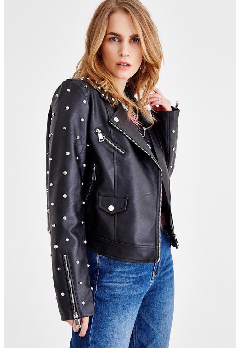 - argintiu Imprimeu: uni Material: piele ecologica Croiala: regular fit Guler: cu revere decupate Gluga: fara gluga Lungime maneca: maneca lunga Detalii: aplicatii cu nituri