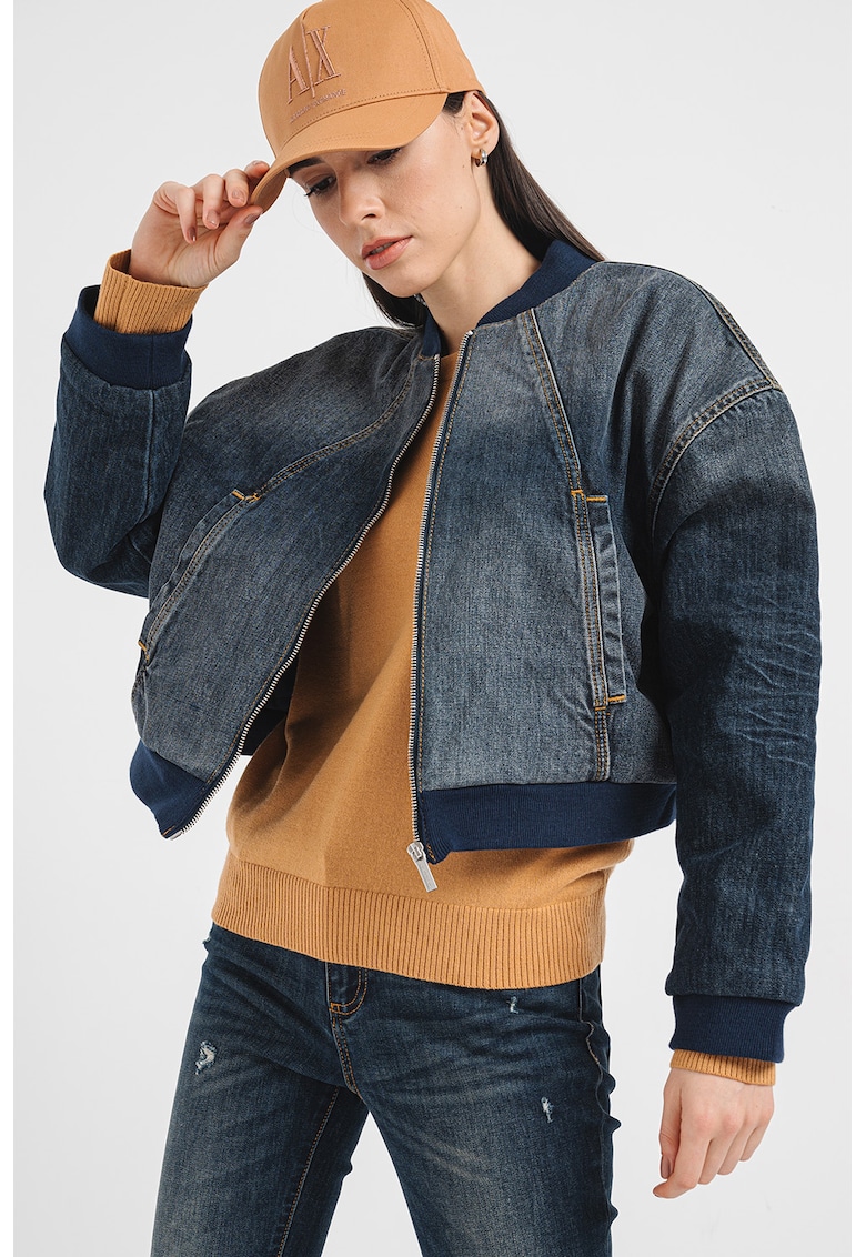 Caracteristici Tip produs: jacheta Culoare: albastru Imprimeu: logo Material: denim Croiala: lejer Gluga: fara gluga Maneci: cazute Lungime maneca: maneca lunga Buzunare: 2 oblice Detalii: aspect decolorat Sistem inchidere: fermoar Compozitie Exterior: 100% bumbac Info model Modelul poarta un produs de marimea S. Marimi model: 177 cm inaltime