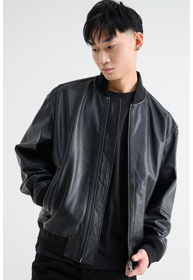 Caracteristici Tip produs: jacheta Culoare: negru Material: piele naturala Croiala: regular fit Imprimeu: uni Gluga: fara gluga Guler: baseball Lungime maneca: maneca lunga Buzunare: interior