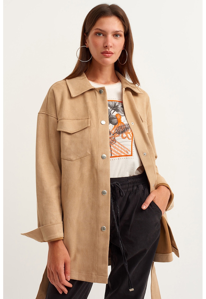 Caracteristici Tip produs: jacheta Culoare: maro nisip Imprimeu: uni Material: sintetic Croiala: regular fit Guler: clasic Gluga: fara gluga Maneci: mansete cu capse Lungime maneca: maneca lunga Buzunare: cu clapa pe piept Detalii: cordon asortat Sistem inchidere: capse Compozitie Exterior: 90% poliester