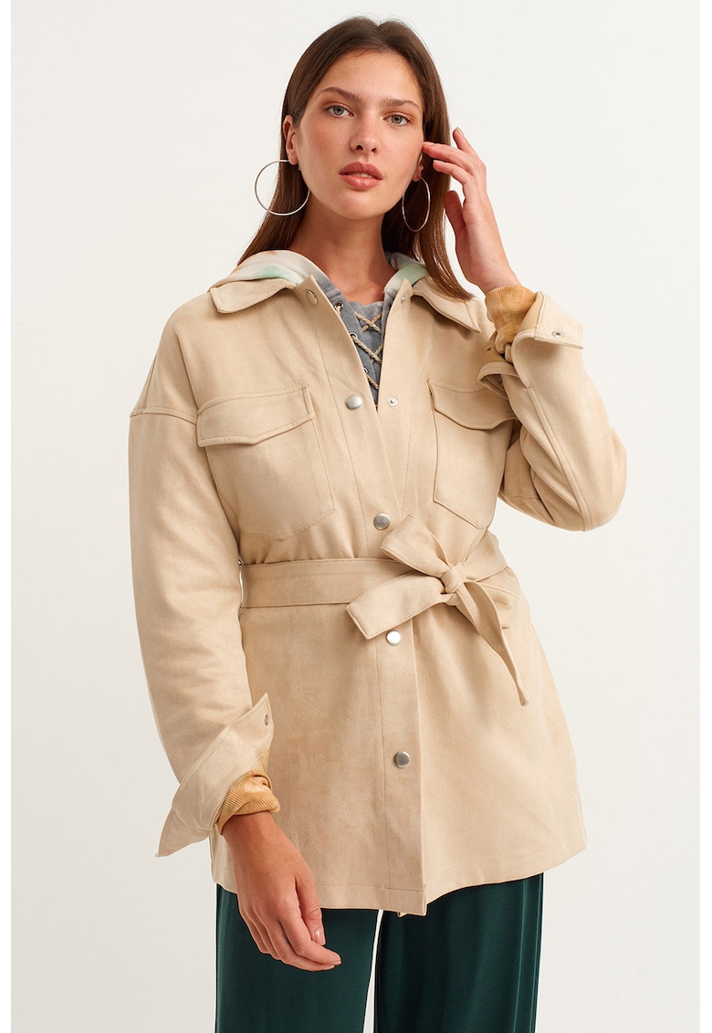 Caracteristici Tip produs: jacheta Culoare: bej Imprimeu: uni Material: sintetic Croiala: regular fit Guler: clasic Gluga: fara gluga Maneci: mansete cu capse Lungime maneca: maneca lunga Buzunare: cu clapa pe piept Detalii: cordon asortat Sistem inchidere: capse Compozitie Exterior: 90% poliester