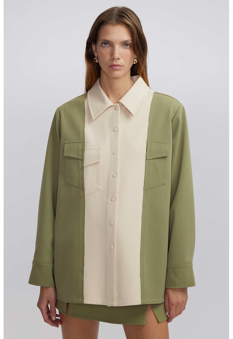 - viscoza Croiala: lejer Guler: clasic Lungime maneca: maneca lunga Detalii: aspect 2 in 1 Sistem inchidere: capse Compozitie Exterior: 77% poliester