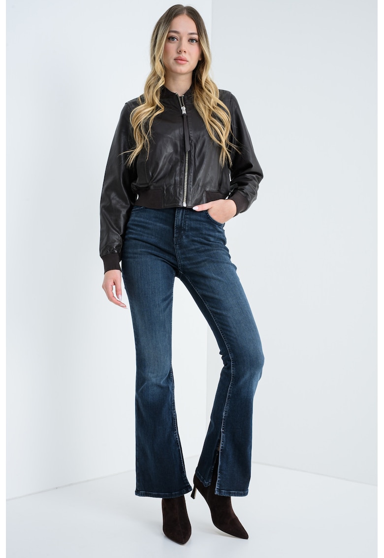 Caracteristici Tip produs: jacheta Culoare: maro inchis Imprimeu: uni Material: piele naturala Croiala: crop Guler: scurt Gluga: fara gluga Lungime maneca: maneca lunga Sistem inchidere: fermoar Compozitie Exterior: 100% piele de oaie Captuseala: 100% poliester reciclat Material garnituri: 97% bumbac