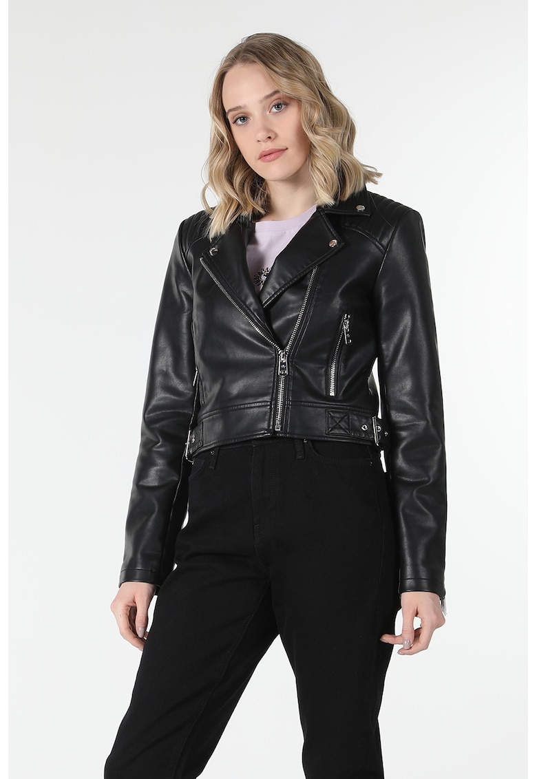 Caracteristici Tip produs: jacheta Culoare: negru Imprimeu: uni Material: piele ecologica Croiala: regular fit Guler: cu revere Gluga: fara gluga Lungime maneca: maneca lunga Buzunare: laterale Detalii: design crop Sistem inchidere: fermoar Compozitie Exterior: 100% poliuretan Captuseala: 100% poliester