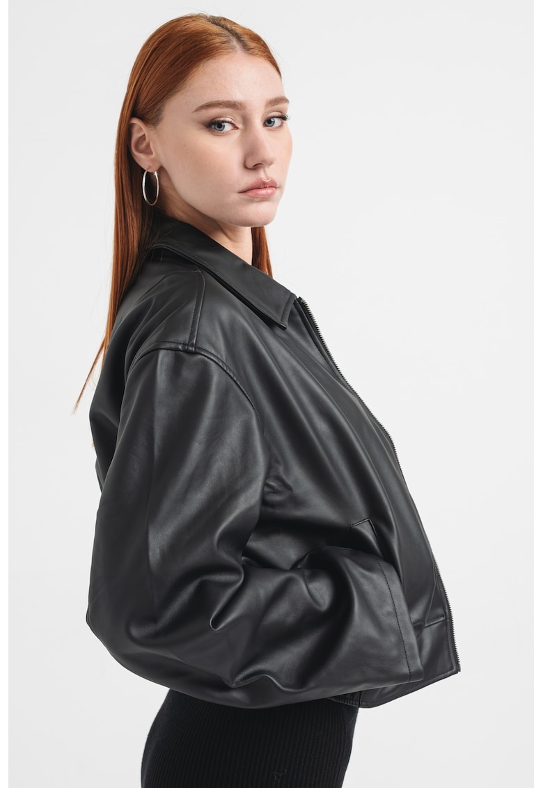 Caracteristici Tip produs: jacheta Culoare: negru Imprimeu: uni Material: piele ecologica Croiala: crop Gluga: fara gluga Lungime maneca: maneca lunga Buzunare: laterale